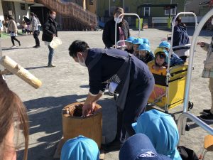 大きな臼に入れたホカホカのもち米をお手伝いのお父さんたちと一緒に、「ぺったん!ぺったん!」と順番につくことができました!